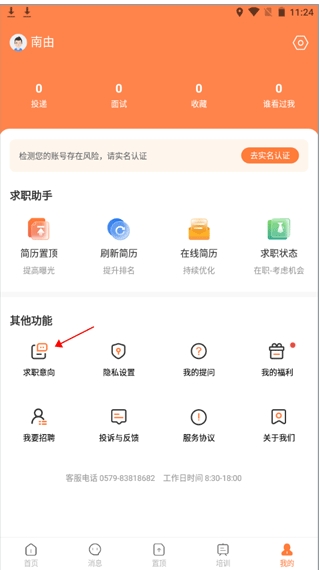 1、切换到“我的”界面,点击其他功能的“求职意向”;